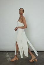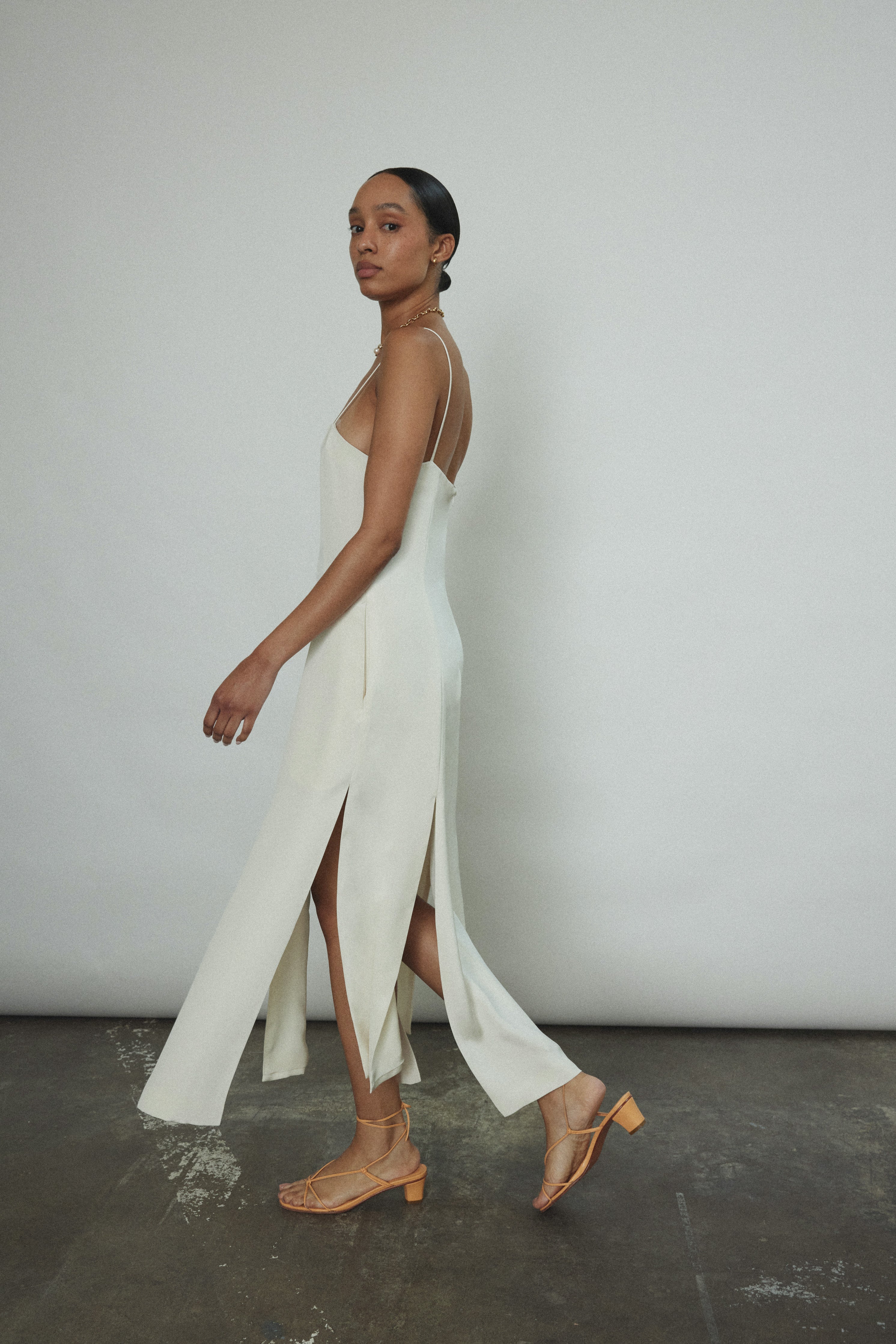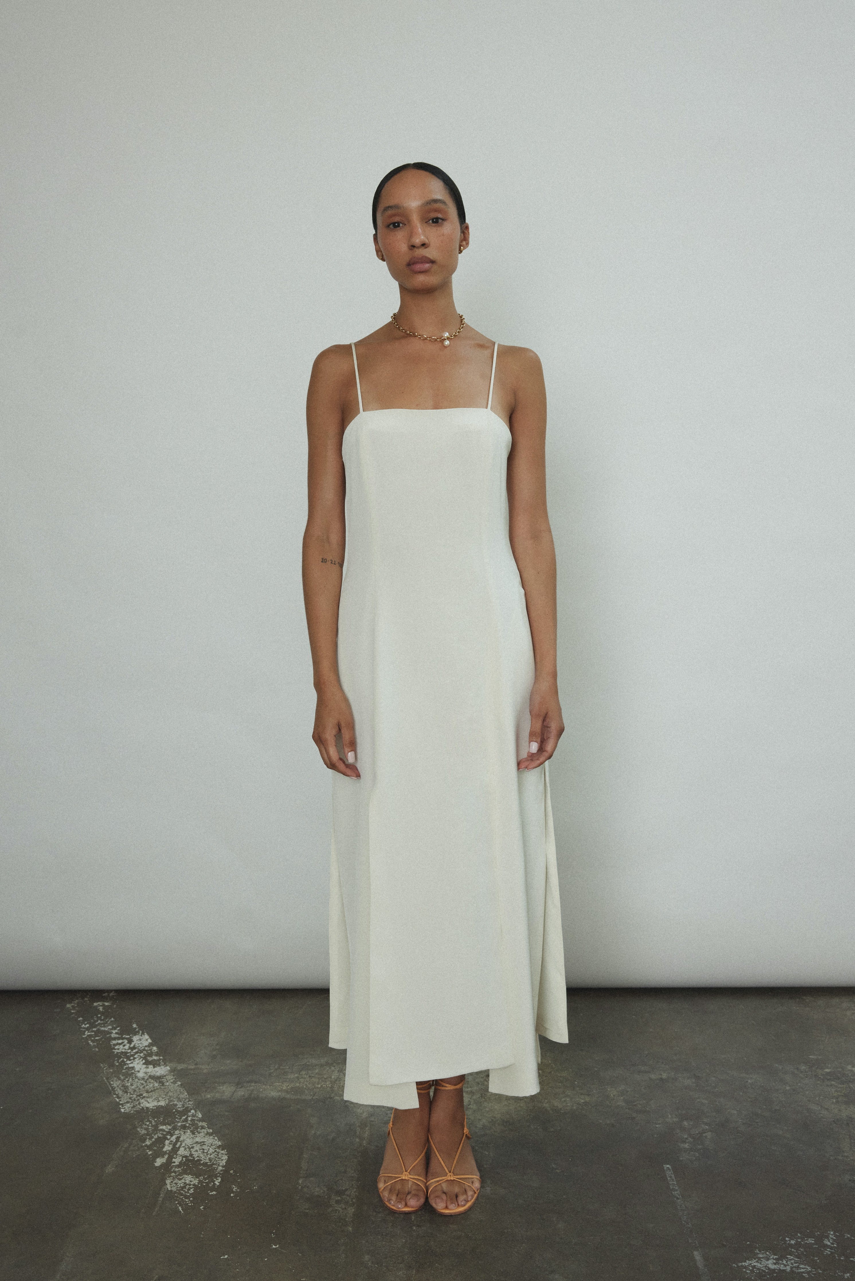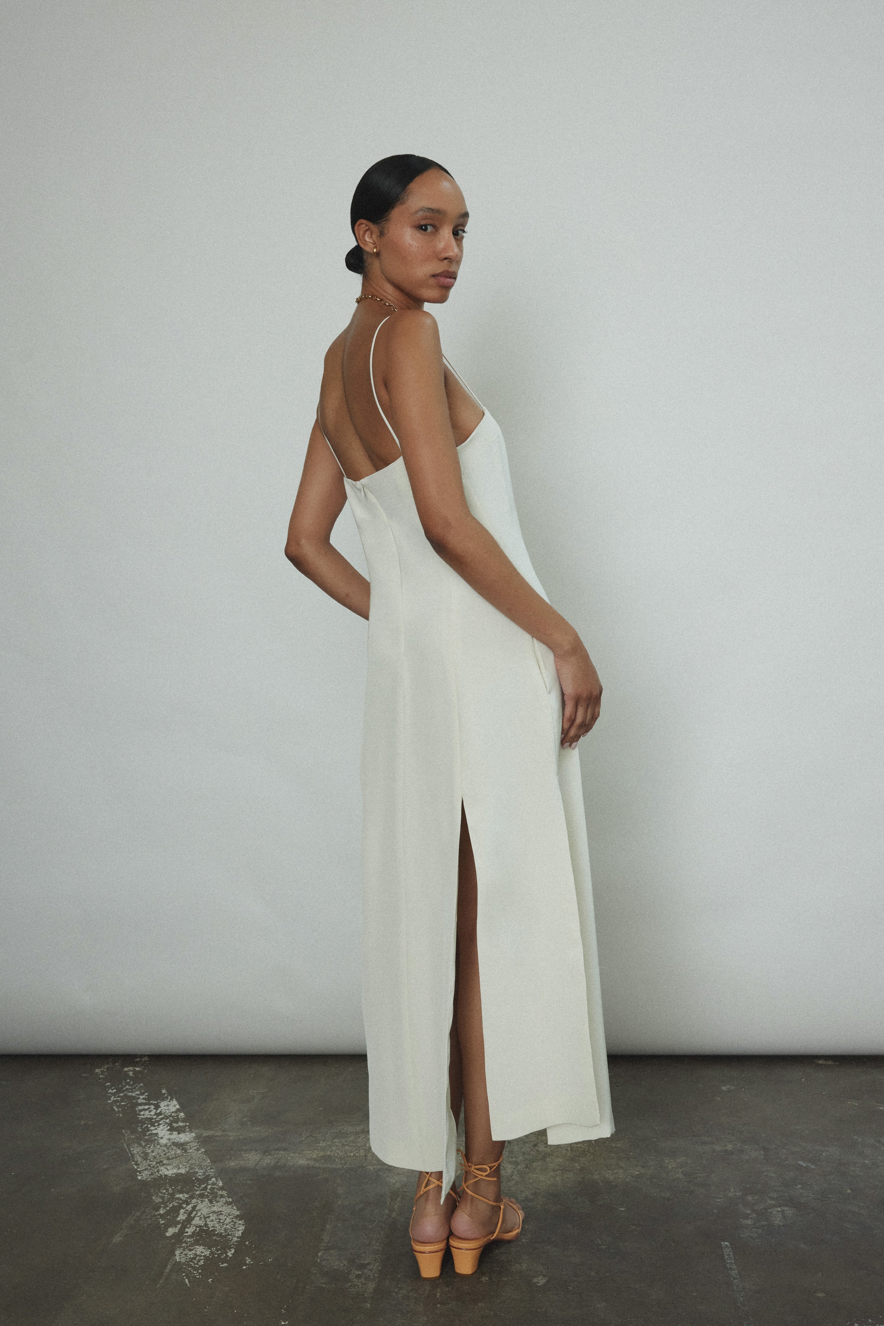 Midi length slip dress composed from a silk crepe fabric. Sleek, straight cut silhouette clean finished throughout. Multi slit hemline creates movement and allows for interesting layering.