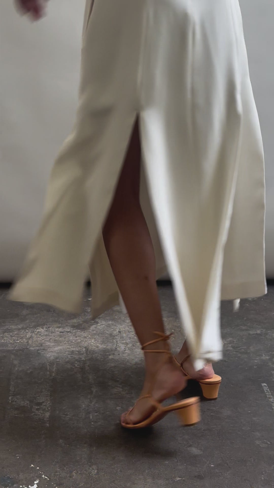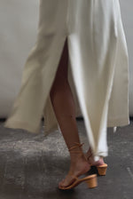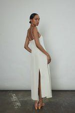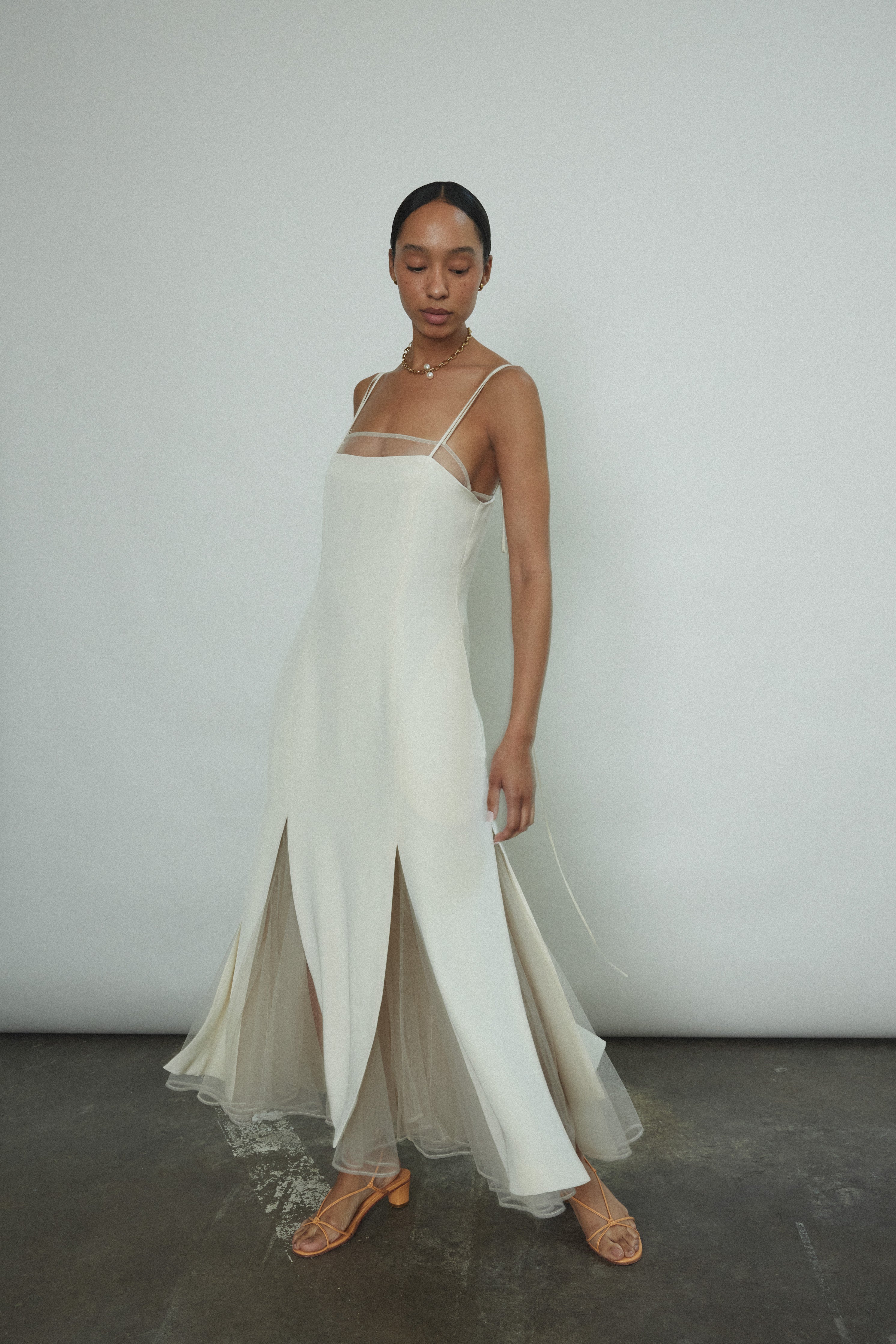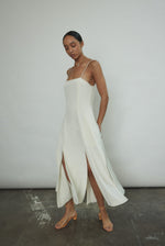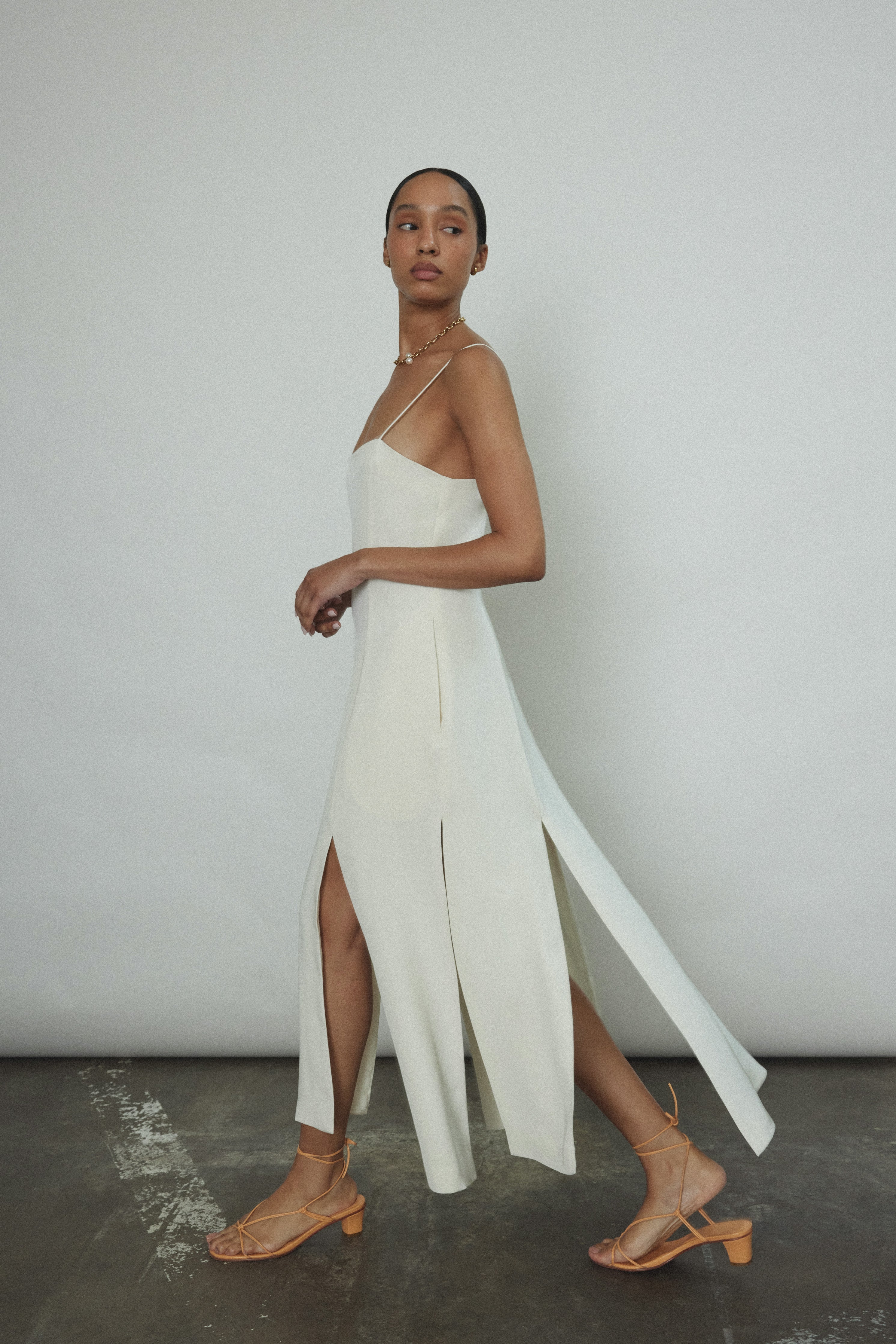Midi length slip dress composed from a silk crepe fabric. Sleek, straight cut silhouette clean finished throughout. Multi slit hemline creates movement and allows for interesting layering.