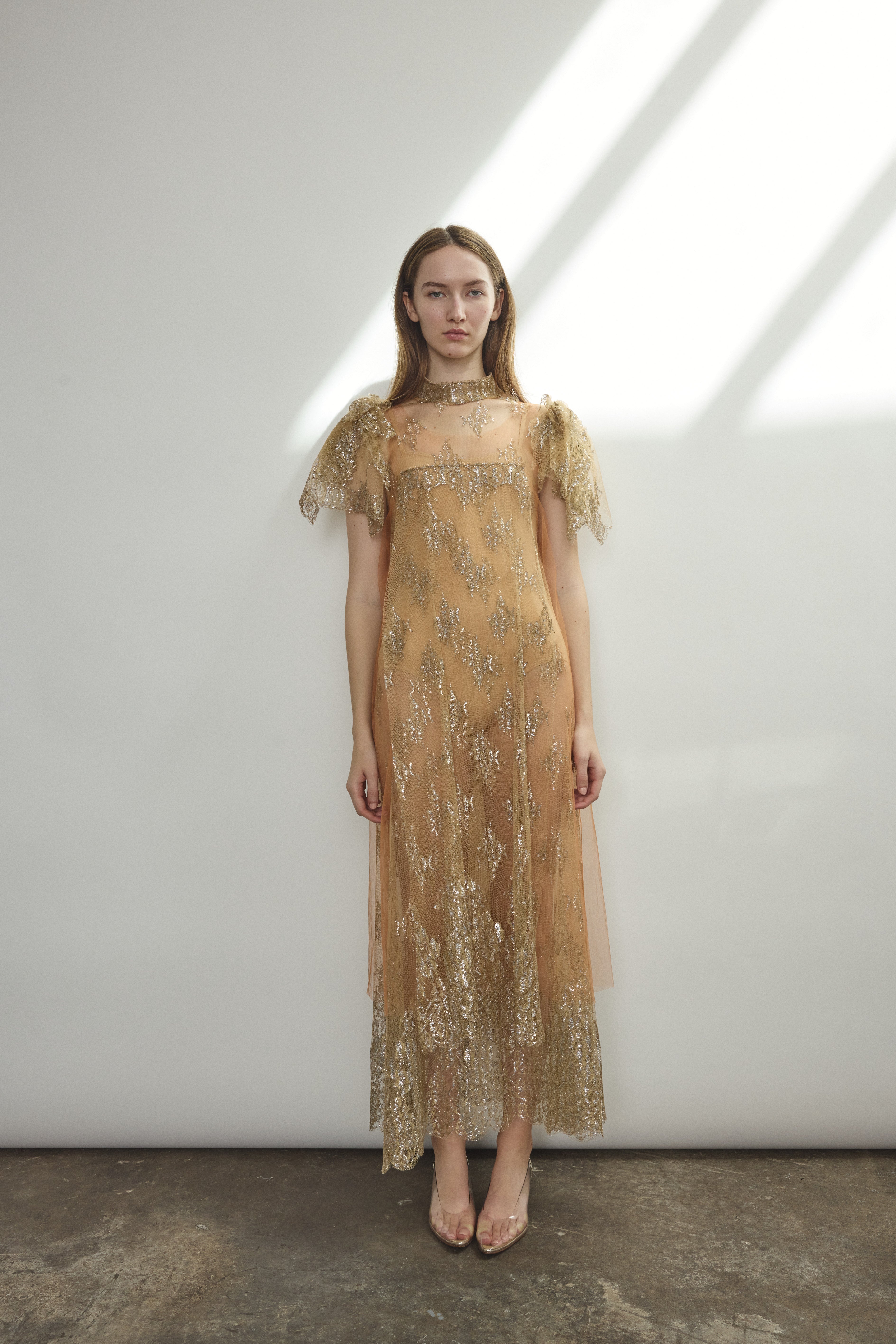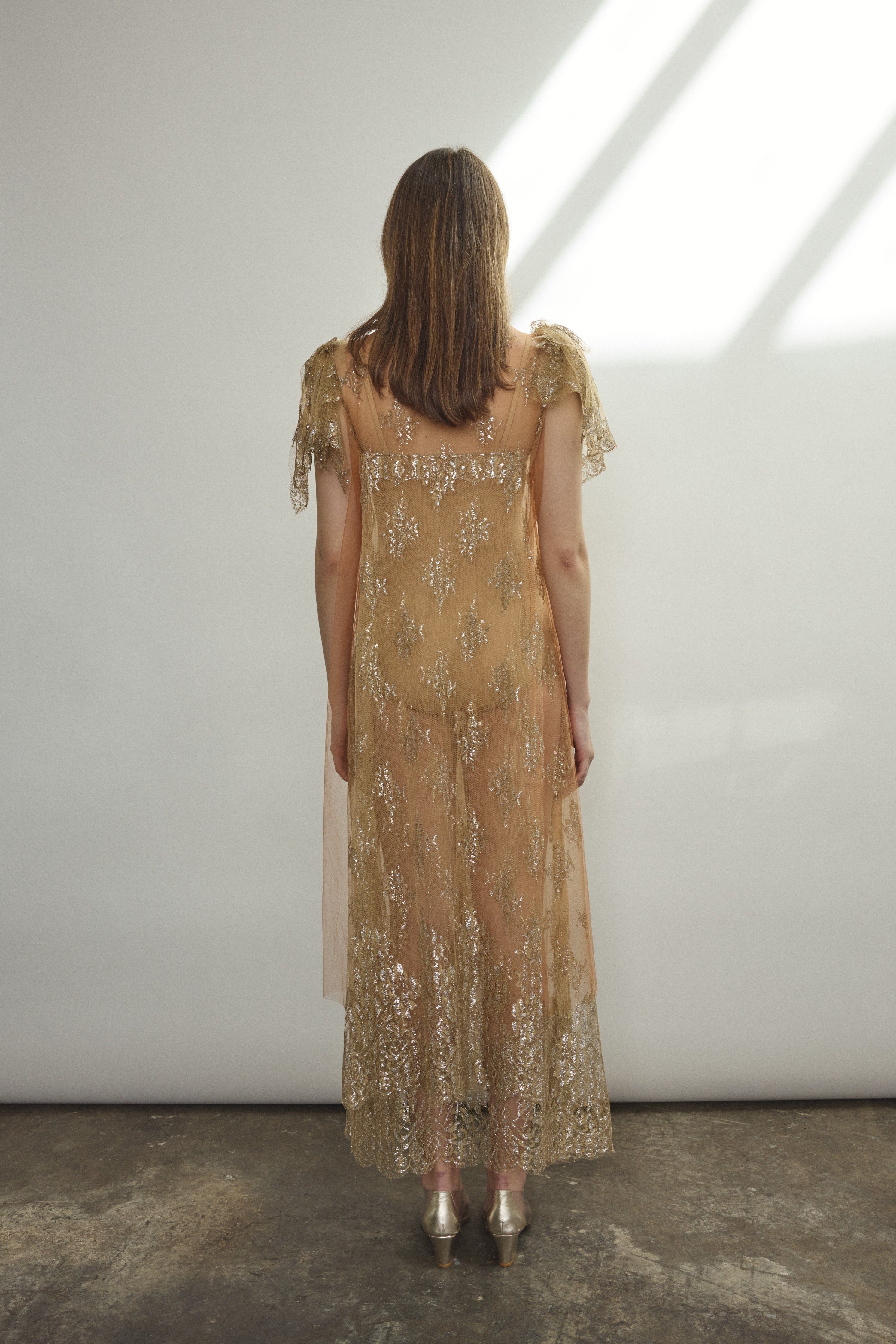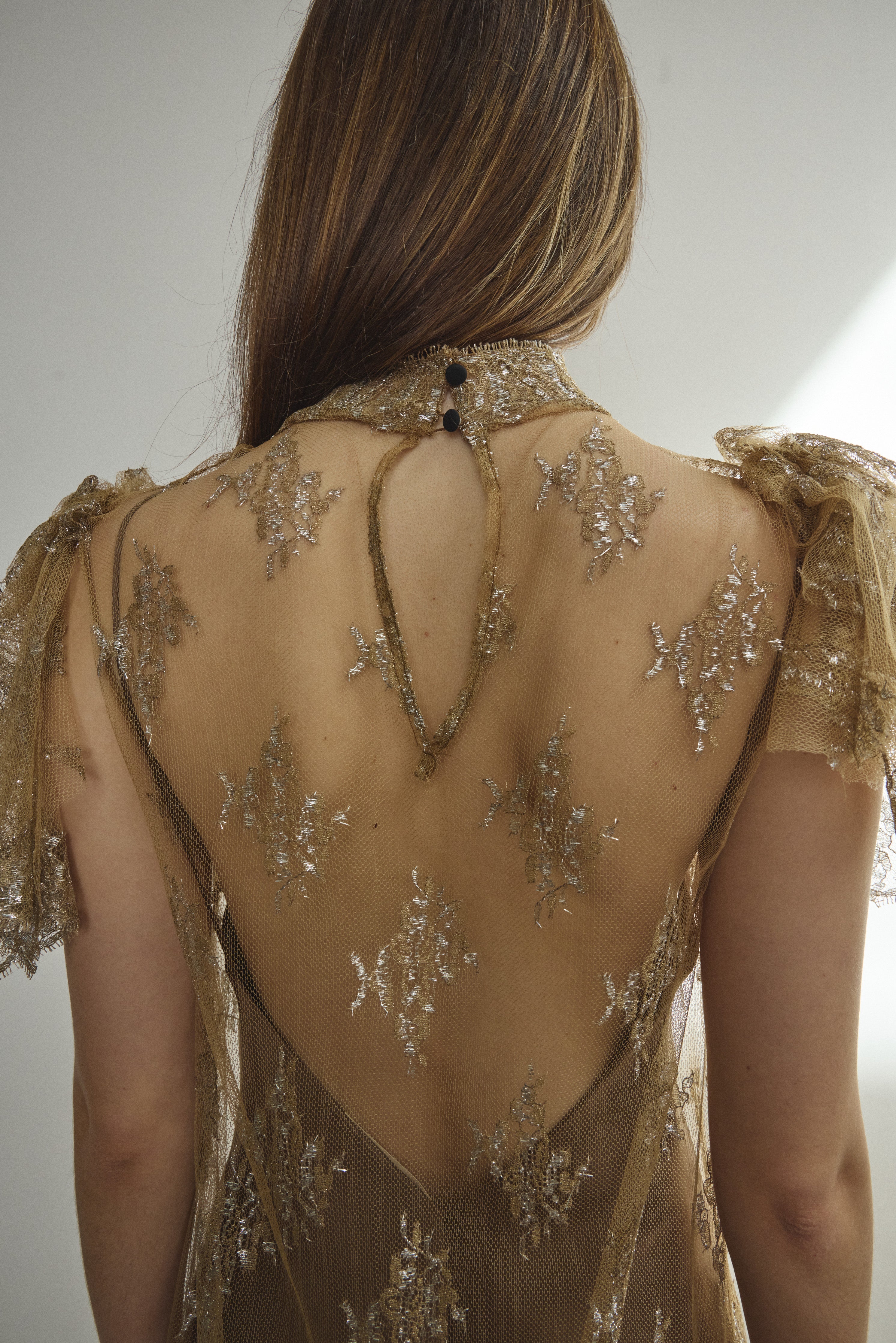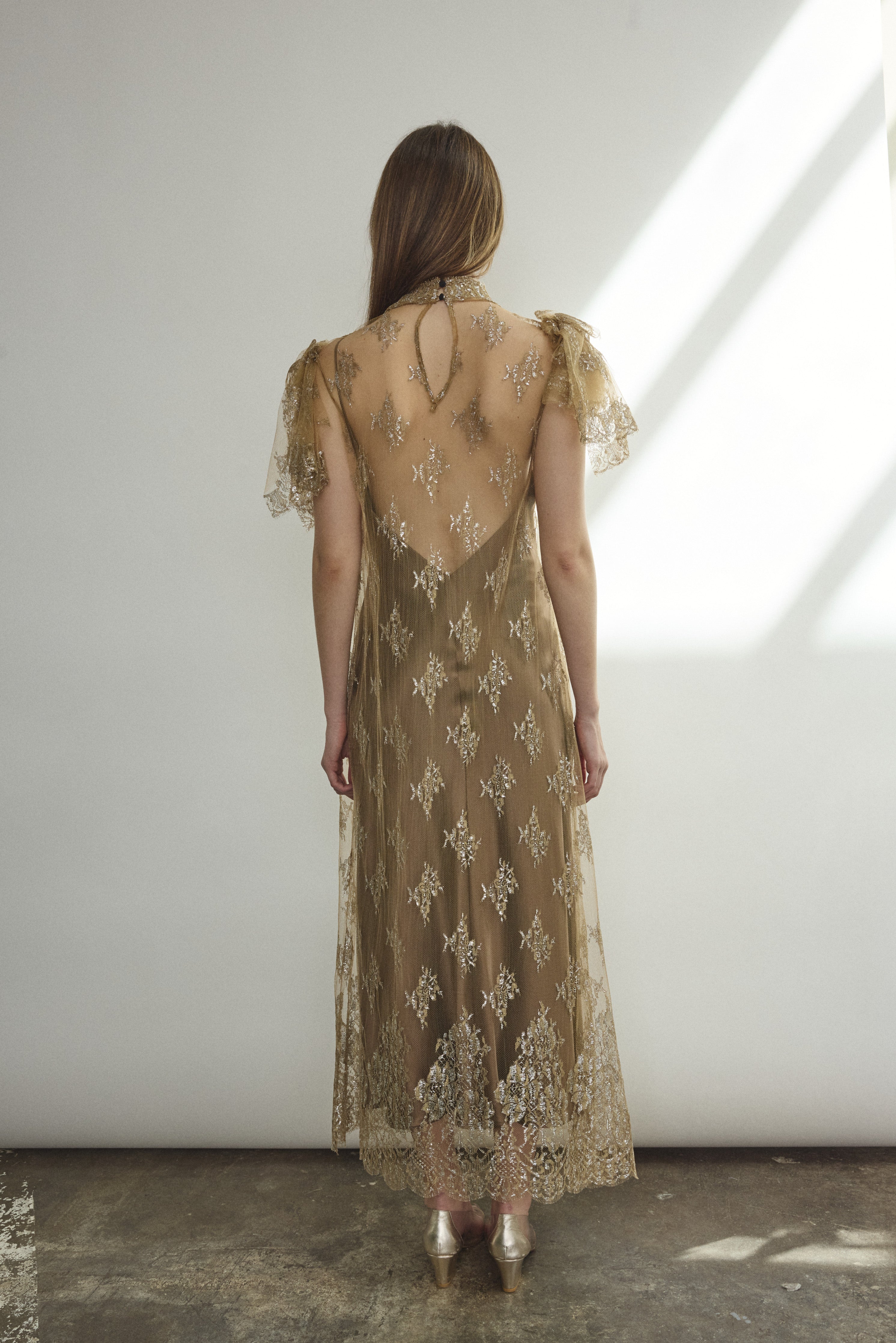 Mock neck sheath dress constructed from a delicate French lace. Straight cut silhouette in a soft neutral tulle with metallic detailing throughout. Deconstructed cap sleeve with raw hem, black silk button closure at center back neck. Unlined.