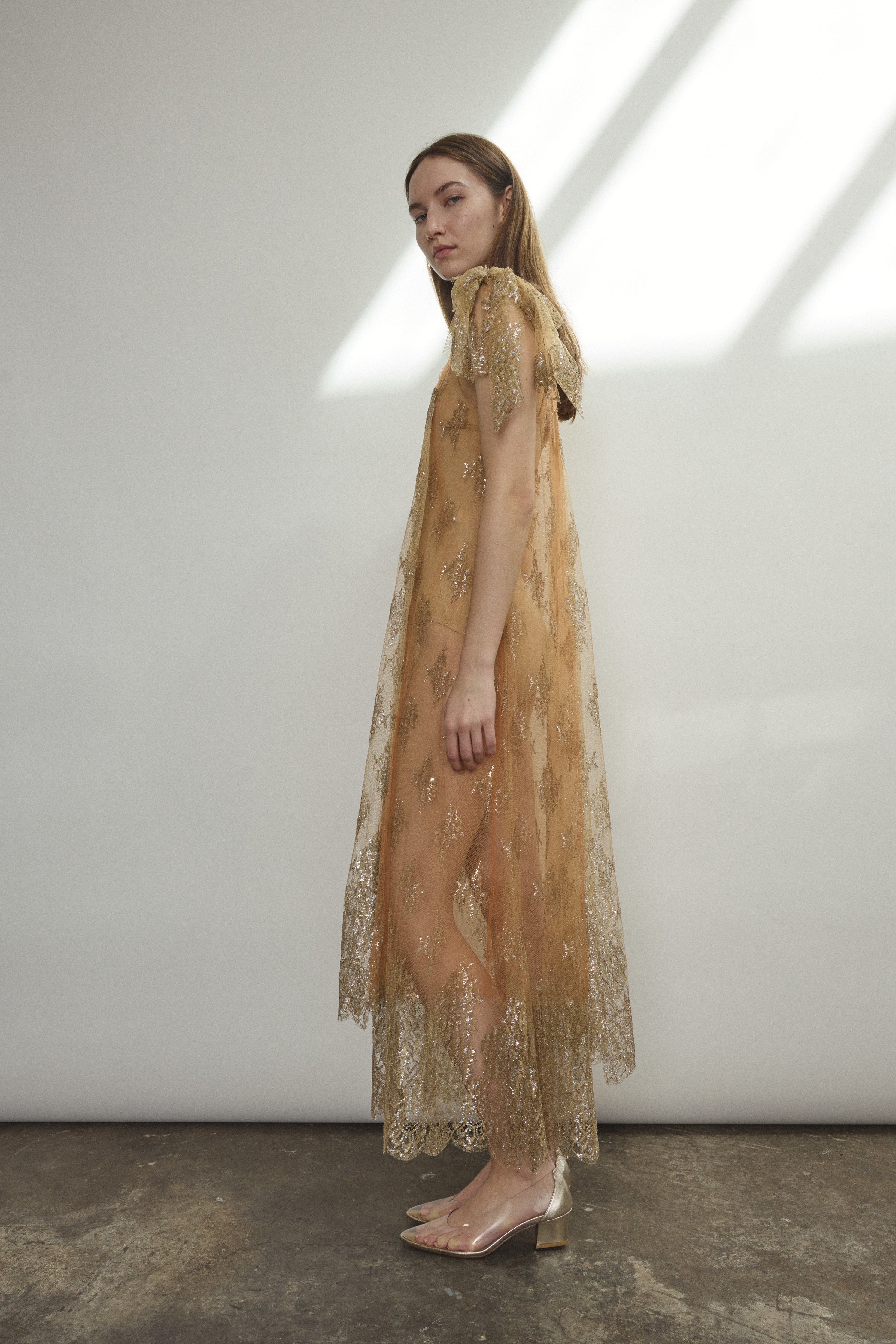 Slip sold separately. Show here with Caroline Midi Slip in Mushroom (photos 1-4), and layered with Thistle Lace Shift (photos 5-8).